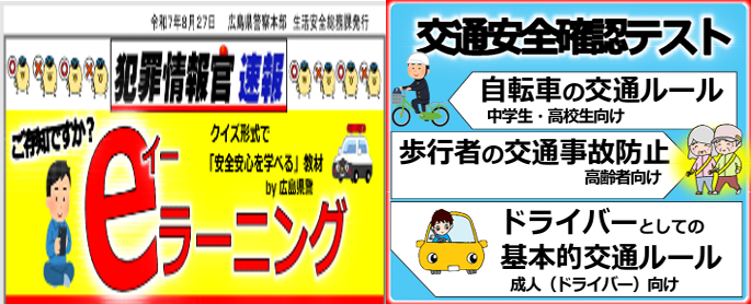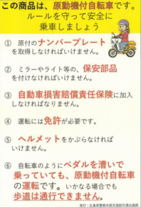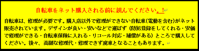 最 新 情 報 組合員は、会員ページ・全国会員ページ確認を!! 青色切符(自転車への交通反則通告制度導入)【自転車ルールブック】作成R7.9) 不明な点は 広島県警察にお問い合わせください 自転車用ヘルメットの安全性を示すマークについて ― 消費者庁が自転車用ヘルメットを標ぼうする商品に関する措置命令を実施 ―(12月12日15時30分公表)自転車用ヘルメットにおける外形上の主な注意点-結合済み (1) 道路交通法改正R6.11.01など 広島県警察より改正道路交通法等の施行に伴う自転車等の安全利用促進等に関する広報 自転車の傘差し運転等は禁止! ながらスマホの禁止・酒気帯び運転及び幇助への罰則・ペダル付き原動機付自転車の運転の定義 自転車事故では頭部の怪我が50%以上です。ヘルメット着用は努力義務です。 自転車保険加入義務化です Ⅰ. 確 認 情 報 ※. 自転車の盗難が多発しています。少しの時間だから大丈夫はありません。 施錠を必ずしましょう(7割が鍵を付けたままで盗難に有っています)【自宅敷地内・アパート、マンション駐輪場・駅・コンビニ】は 特に注意を Ⅱ. お 知 ら せ お知らせ一覧へ (過去のお知らせもご覧いただけます) 1. 電動キックボード・特定小型原動機付自転車 警察庁 公表特定小型原動機付自転車(いわゆる電動キックボード等)の交通方法等に関する規定 特定小型原動機付自転車に関する交通ルール等について 電動キックボード・特定小型原動機付自転車で 免許証のいらない物は 二輪車防犯登録は不要です。 1. モペットバイク 情 報重要 ペダルのみをこいで走行しても 自転車にはなりません。 原動機付自転車又は自動車です ペダル付き電動バイク(ペダル付き原動機付自転車・モペット)は 原動機付自転車 又は 自動車です。 2. サイクリング・イベント情報 (サイクリング案内記載希望の方、問合わせにメールください) 3. リコール・無償点検 情 報 バッテリー注意喚起(NITE) キーワードに”自転車”で検索 ※自転車・関連部品のリコール・無償点検の情報提供をお願い致します。(確認後公表します) 4. 自転車技士・安全整備士資格試験 受験予定者様 自転車安全整備士 自転車技士 Ⅲ. 自転車の事故・トラブルでお困りの方の相談窓口 他県の自転車組合はリンクに記載(HP作成の組合のみ紹介中)